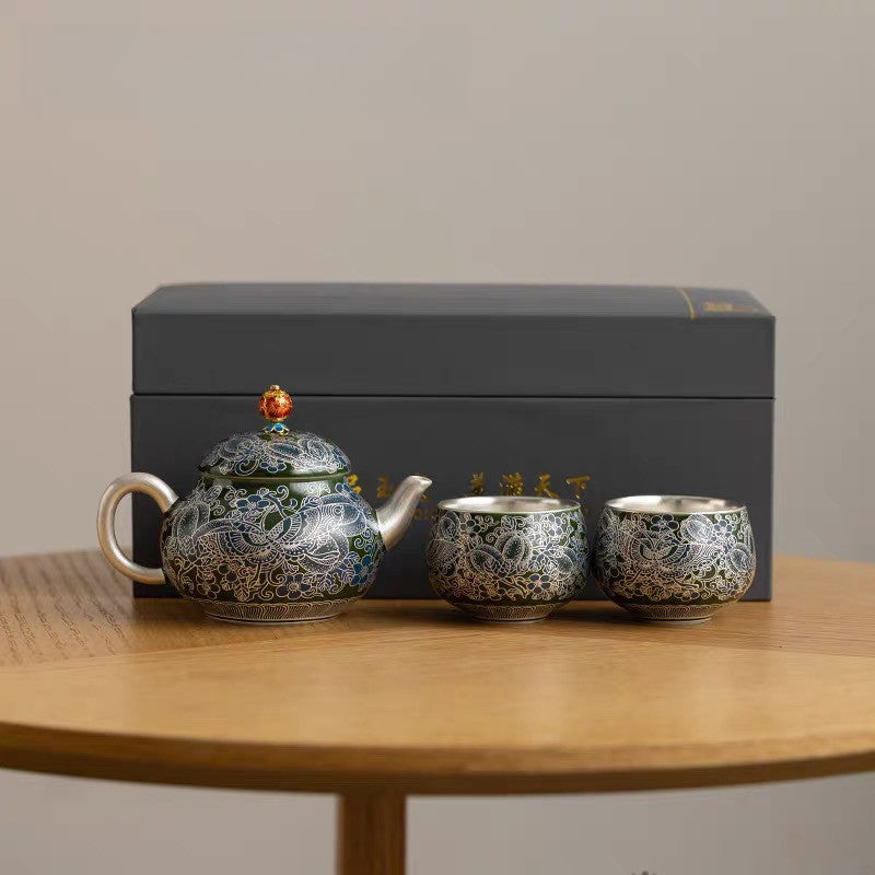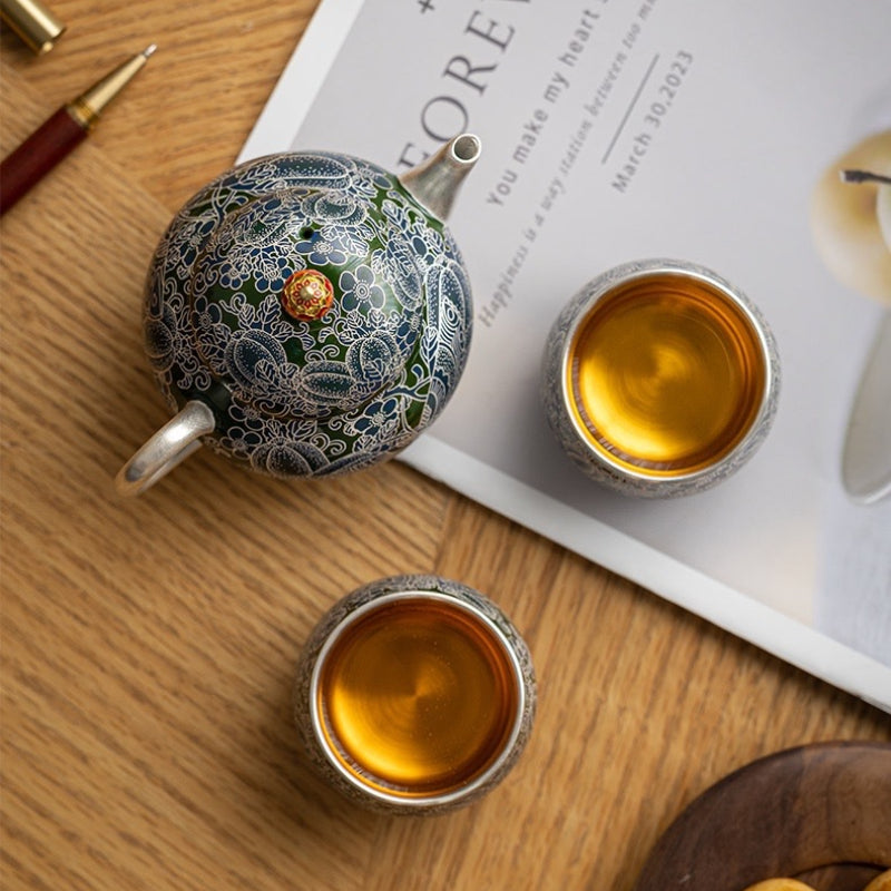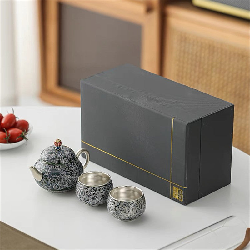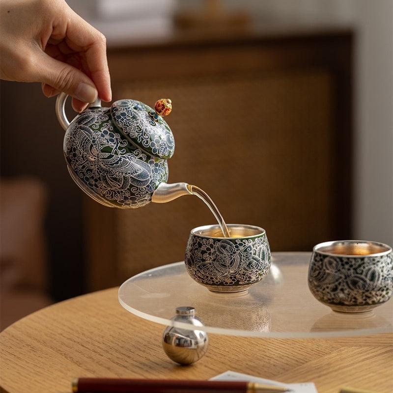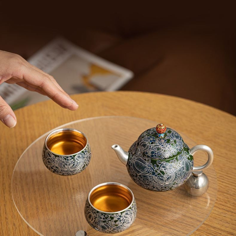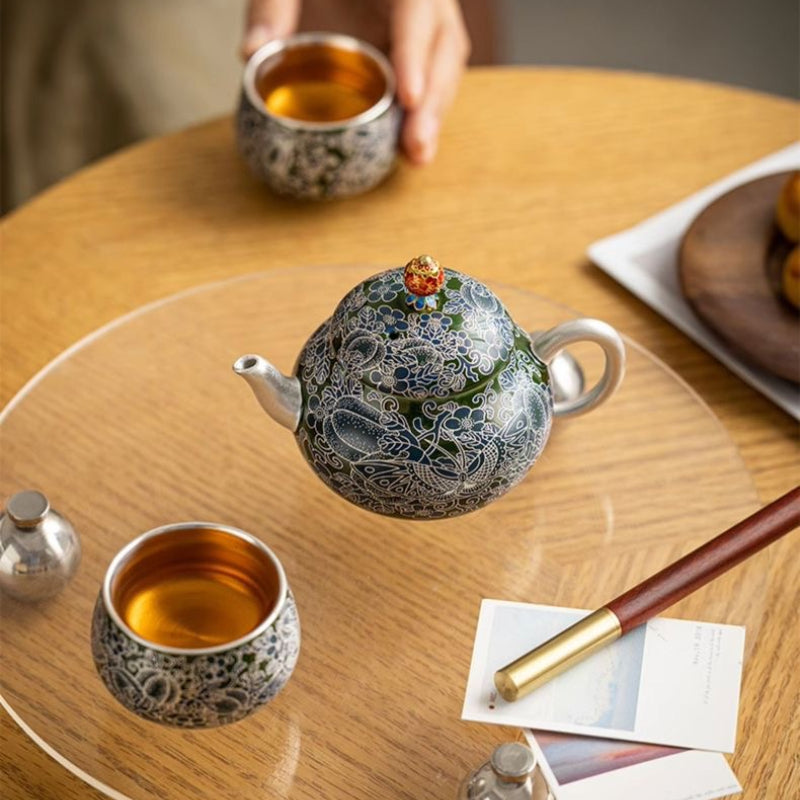 Crafted with premium silver-infused ceramic glaze, this 180ml tea set combines minimalist aesthetics with functional design. The porous clay naturally enhances tea aroma, while the silver-glazed surface resists stains and adds a contemporary touch.