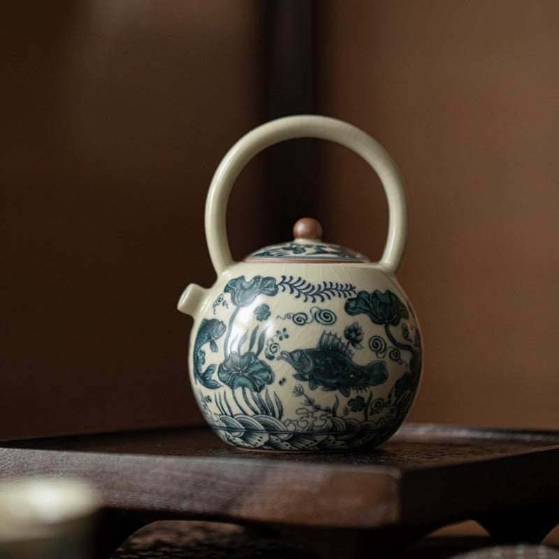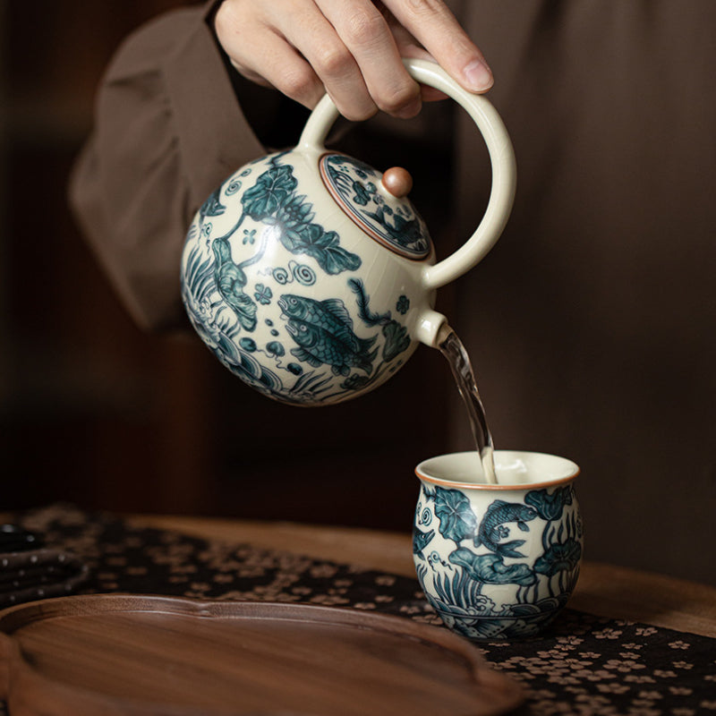 · Ru Kiln Aesthetic – Soft celadon glaze with subtle crackle patterns and fish & waterweed motifs